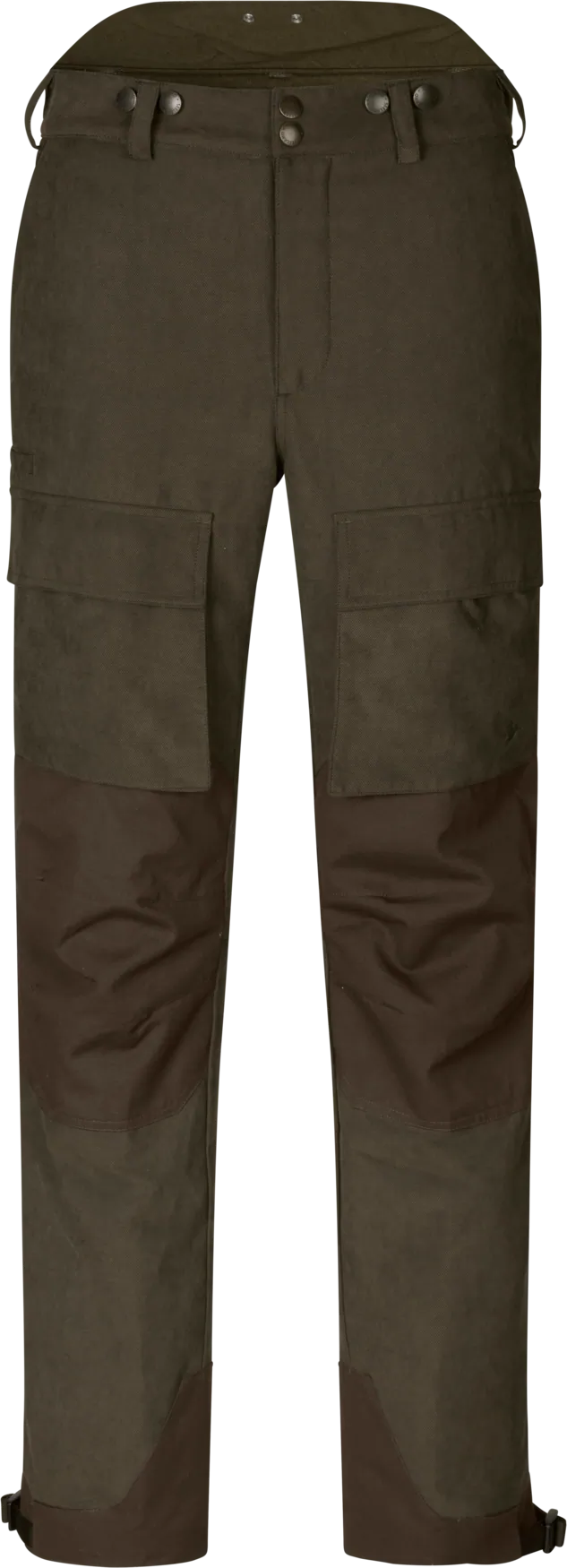 The Helt II trousers have a warm Thinsulate™ lining, to keep you snug, even as the temperature descends towards freezing. They also feature our own waterproof, windproof and breathable SEETEX® membrane, with its hydrostatic head of 10,000 mm. In all, these are excellent trousers for autumn and winter days, in cold and changeable weather, rain, sleet or snow. They have long, mesh-backed zips on the upper thighs, to provide ventilation, while keeping out dirt and the like. The trousers have a high waist at the back, to keep you covered when bending down or sitting at your post, and there are braces button on the waist. The Helt II trousers have slanted front pockets and two large pockets on the thighs. The right-hand thigh pocket contains a 4-shot cartridge holder, and the pockets have silent magnetic closures, for access to your cartridges without disturbance. There is also a handy knife pocket on the upper right thigh. The trousers have articulated knees, so they won’t ride up when you sit down, and there are velcro adjusters behind the knees. They are also reinforced with extra durable fabric at the knees and ankles, where wear is usually greatest. There are ankle adjustment straps to fit the trousers closely around your boots. There are also small hidden metal hooks at the ankles to attach to your bootlaces, to prevent the trouser legs riding up as you move.